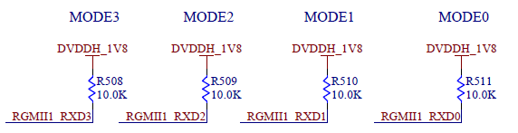 MODE0, MODE1 and MODE2 pins on the PHY are now strapped to match the dev kit schematic (same pull-up / pull-down configuration).